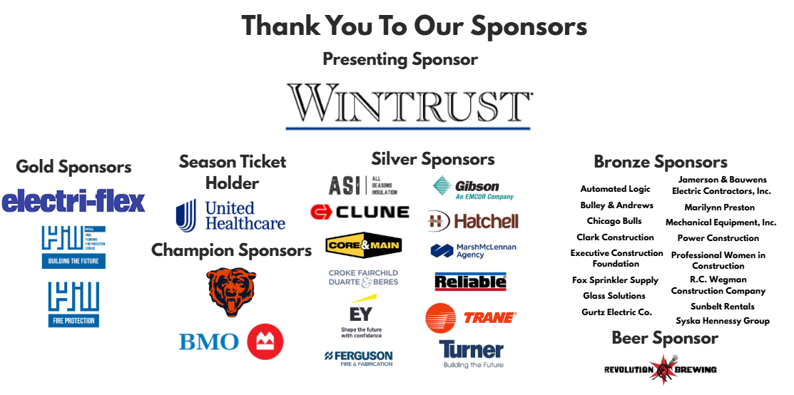 Aetna, Anning-Johnson Company, Atténuer Risk, Byford Construction, Cushman & Wakefield, Design Collective by Cintas, Executive Construction Foundation, Grandpa Frank’s Candy, Hatchell & Associates, Lettuce Entertain You, Mortenson, NFP, Pepper Construction, Power Construction, Project Management Advisors, Inc., SPARK Tee Time, Wintrust